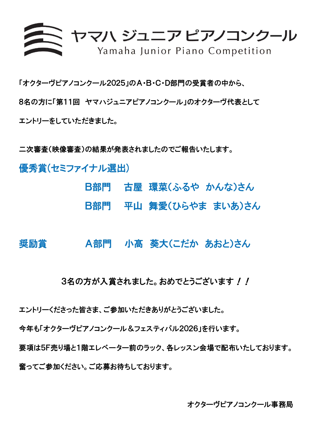 第11回ヤマハジュニアピアノコンクール二次選考の結果発表